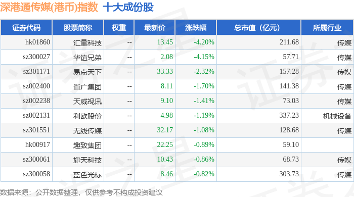 深港通传媒(港币)(983076)指数十大成份股详情如下: