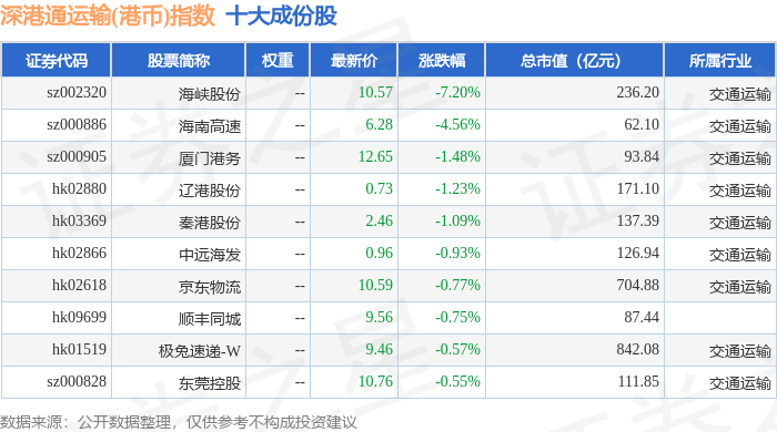 深港通运输(港币)(983078)指数十大成份股详情如下: