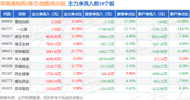 资金流向方面,深港通制药(港币)(983080)指数成份股当日主力资金净流入合计2.07亿元,游资资金净流出合计3.29亿元,散户资金净流入合计1.22亿元。成份股资金流向详情见下表: