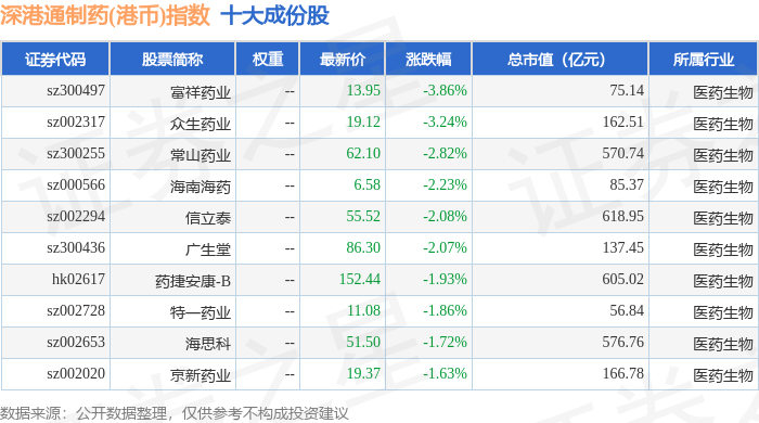 深港通制药(港币)(983080)指数十大成份股详情如下: