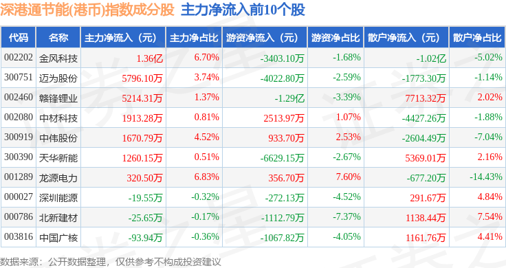 资金流向方面,深港通节能(港币)(983086)指数成份股当日主力资金净流出合计39.77亿元,游资资金净流入合计7.57亿元,散户资金净流入合计32.2亿元。成份股资金流向详情见下表: