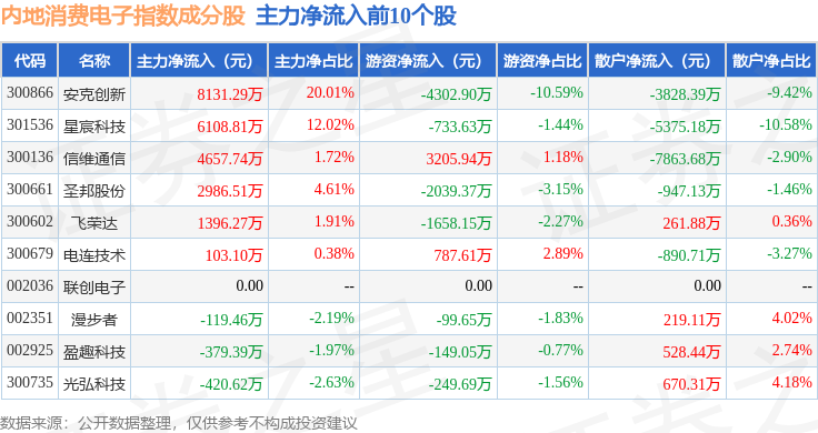 资金流向方面,内地消费电子(983105)指数成份股当日主力资金净流出合计45.0亿元,游资资金净流入合计14.64亿元,散户资金净流入合计30.36亿元。成份股资金流向详情见下表:
