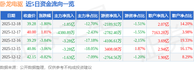 证券之星消息,截至2025年12月18日收盘,卧龙电驱(600580)报收于39.28元,下跌1.8%,换手率2.34%,成交量36.51万手,成交额14.55亿元。