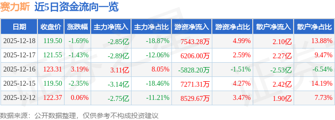 证券之星消息,截至2025年12月18日收盘,赛力斯(601127)报收于119.5元,下跌1.69%,换手率0.83%,成交量12.59万手,成交额15.11亿元。