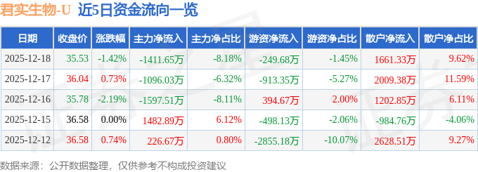 证券之星消息,截至2025年12月18日收盘,君实生物(688180)报收于35.53元,下跌1.42%,换手率0.63%,成交量4.81万手,成交额1.73亿元。