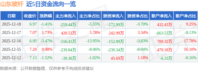 证券之星消息,截至2025年12月18日收盘,山东玻纤(605006)报收于6.97元,下跌1.41%,换手率1.11%,成交量6.66万手,成交额4675.02万元。