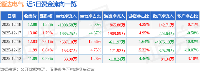 证券之星消息,截至2025年12月18日收盘,通达电气(603390)报收于12.88元,下跌1.38%,换手率4.46%,成交量15.64万手,成交额2.02亿元。
