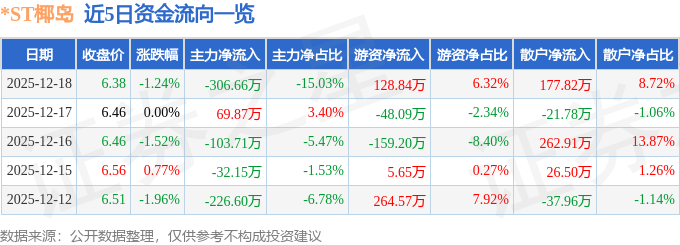 证券之星消息,截至2025年12月18日收盘,*ST椰岛(600238)报收于6.38元,下跌1.24%,换手率0.71%,成交量3.16万手,成交额2040.07万元。