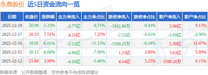 12月18日的资金流向数据方面,主力资金净流出3.77亿元,占总成交额8.71%,游资资金净流出1842.8万元,占总成交额0.43%,散户资金净流入3.96亿元,占总成交额9.13%。
