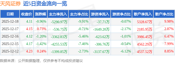 证券之星消息,截至2025年12月18日收盘,天风证券(601162)报收于4.11元,下跌0.96%,换手率1.5%,成交量128.91万手,成交额5.34亿元。