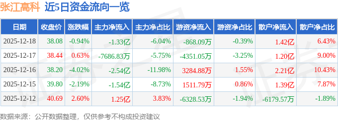 证券之星消息,截至2025年12月18日收盘,张江高科(600895)报收于38.08元,下跌0.94%,换手率3.62%,成交量56.08万手,成交额22.04亿元。