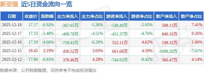 证券之星消息,截至2025年12月18日收盘,新亚强(603155)报收于17.17元,下跌0.92%,换手率1.25%,成交量3.95万手,成交额6860.71万元。