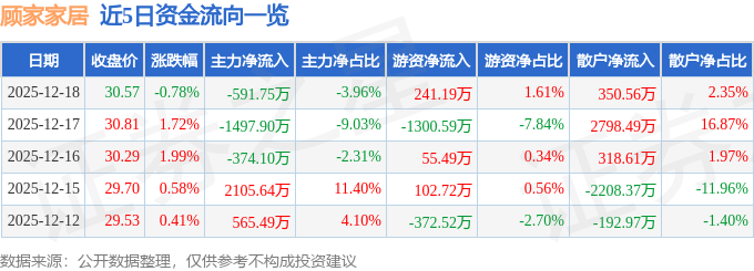 证券之星消息,截至2025年12月18日收盘,顾家家居(603816)报收于30.57元,下跌0.78%,换手率0.6%,成交量4.9万手,成交额1.49亿元。