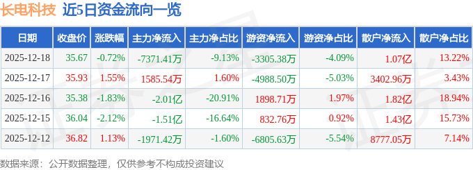 证券之星消息,截至2025年12月18日收盘,长电科技(600584)报收于35.67元,下跌0.72%,换手率1.26%,成交量22.52万手,成交额8.08亿元。
