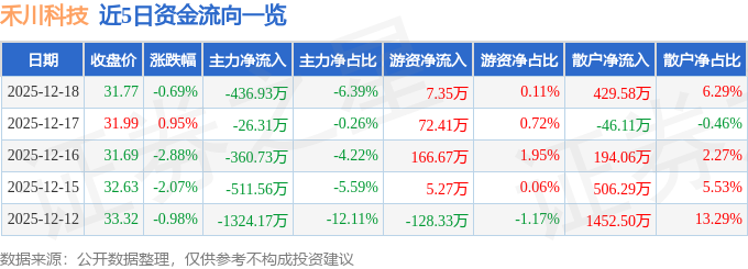 证券之星消息,截至2025年12月18日收盘,禾川科技(688320)报收于31.77元,下跌0.69%,换手率1.41%,成交量2.13万手,成交额6833.76万元。