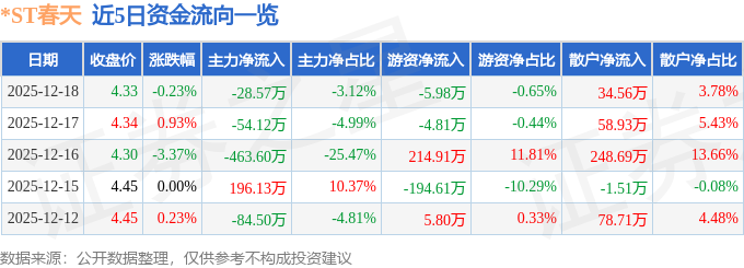 证券之星消息,截至2025年12月18日收盘,*ST春天(600381)报收于4.33元,下跌0.23%,换手率0.36%,成交量2.11万手,成交额914.96万元。