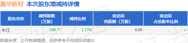 证券之星消息,12月18日星华新材发布公告《星华新材:关于特定股东减持股份计划实施完毕的公告》,其股东牛江于2025年9月24日至2025年12月12日间合计减持199.77万股,占公司目前总股本的1.1746%,变动期间该股股价上涨0.32%,截止12月12日收盘报28.03元。