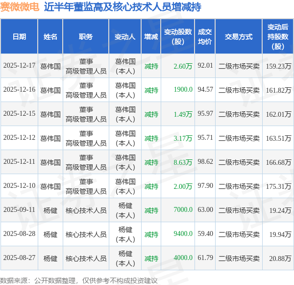赛微微电近半年内的董监高及核心技术人员增减持详情如下: