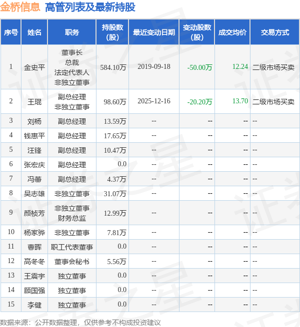 金桥信息近半年内的董监高及核心技术人员增减持详情如下: