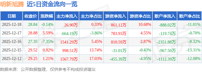 证券之星消息,截至2025年12月18日收盘,明新旭腾(605068)报收于28.84元,下跌0.14%,换手率1.73%,成交量2.8万手,成交额8066.3万元。