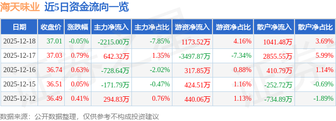 证券之星消息,截至2025年12月18日收盘,海天味业(603288)报收于37.01元,下跌0.05%,换手率0.14%,成交量7.63万手,成交额2.82亿元。