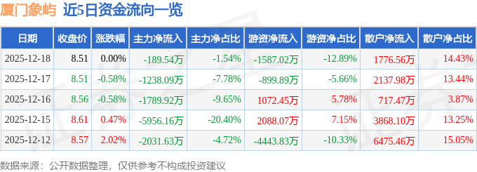 证券之星消息,截至2025年12月18日收盘,厦门象屿(600057)报收于8.51元,上涨0.0%,换手率0.69%,成交量14.42万手,成交额1.23亿元。