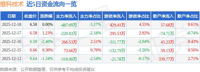 证券之星消息,截至2025年12月18日收盘,维科技术(600152)报收于6.58元,上涨0.0%,换手率2.7%,成交量14.27万手,成交额9430.43万元。