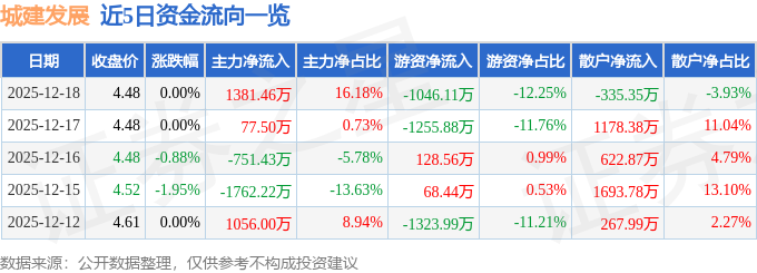 证券之星消息,截至2025年12月18日收盘,城建发展(600266)报收于4.48元,上涨0.0%,换手率0.92%,成交量19.03万手,成交额8537.08万元。