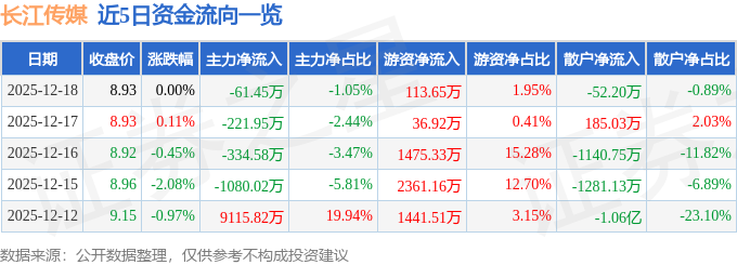 证券之星消息,截至2025年12月18日收盘,长江传媒(600757)报收于8.93元,上涨0.0%,换手率0.54%,成交量6.53万手,成交额5836.74万元。