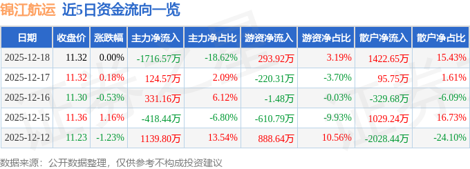 证券之星消息,截至2025年12月18日收盘,锦江航运(601083)报收于11.32元,上涨0.0%,换手率4.18%,成交量8.11万手,成交额9219.92万元。