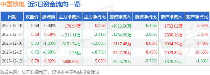 证券之星消息,截至2025年12月18日收盘,中国核电(601985)报收于8.68元,上涨0.0%,换手率0.19%,成交量36.02万手,成交额3.12亿元。
