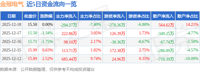 证券之星消息,截至2025年12月18日收盘,金冠电气(688517)报收于15.5元,上涨0.0%,换手率1.87%,成交量2.55万手,成交额3973.99万元。