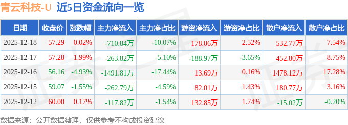 证券之星消息,截至2025年12月18日收盘,青云科技(688316)报收于57.29元,上涨0.02%,换手率2.56%,成交量1.23万手,成交额7062.34万元。