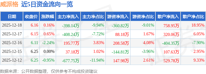 证券之星消息,截至2025年12月18日收盘,威派格(603956)报收于6.16元,上涨0.16%,换手率1.14%,成交量6.48万手,成交额4004.9万元。