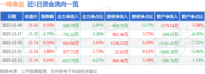 证券之星消息,截至2025年12月18日收盘,一鸣食品(605179)报收于21.42元,上涨0.33%,换手率2.45%,成交量9.81万手,成交额2.12亿元。