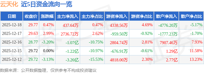 证券之星消息,截至2025年12月18日收盘,云天化(600096)报收于29.77元,上涨0.47%,换手率1.7%,成交量31.07万手,成交额9.24亿元。