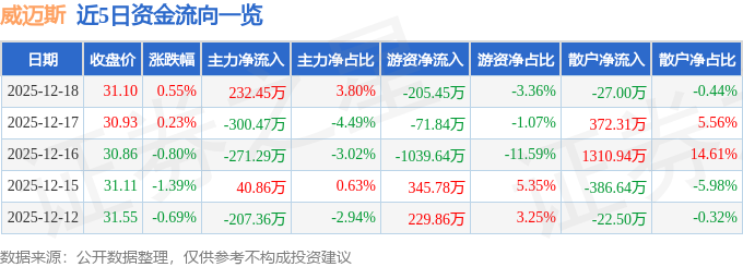 证券之星消息,截至2025年12月18日收盘,威迈斯(688612)报收于31.1元,上涨0.55%,换手率0.78%,成交量1.97万手,成交额6122.91万元。