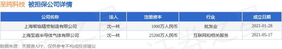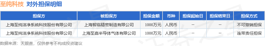 至纯科技12月17日披露2笔对外担保,被担保公司2家。对外担保明细如下表: