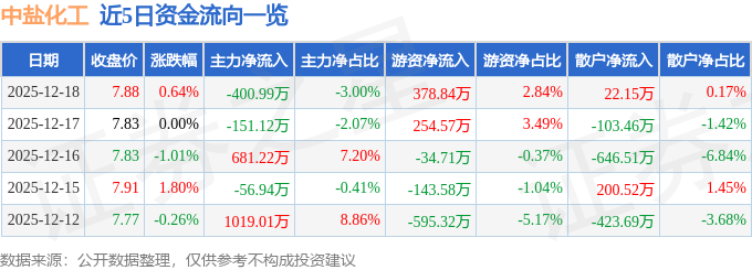 证券之星消息,截至2025年12月18日收盘,中盐化工(600328)报收于7.88元,上涨0.64%,换手率1.15%,成交量16.84万手,成交额1.34亿元。