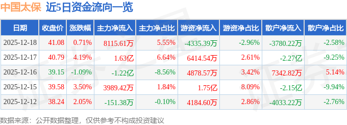 证券之星消息,截至2025年12月18日收盘,中国太保(601601)报收于41.08元,上涨0.71%,换手率0.52%,成交量35.67万手,成交额14.63亿元。
