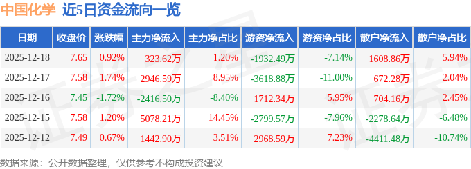 证券之星消息,截至2025年12月18日收盘,中国化学(601117)报收于7.65元,上涨0.92%,换手率0.58%,成交量35.5万手,成交额2.71亿元。