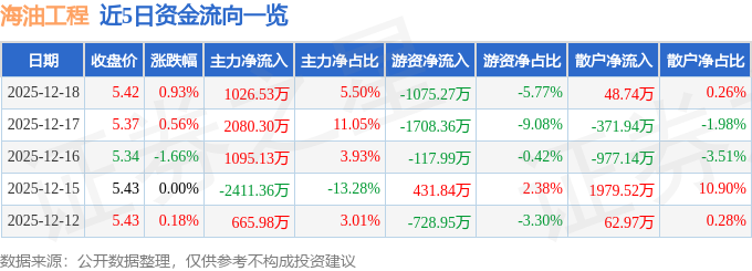 证券之星消息,截至2025年12月18日收盘,海油工程(600583)报收于5.42元,上涨0.93%,换手率0.78%,成交量34.56万手,成交额1.86亿元。