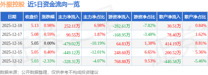 证券之星消息,截至2025年12月18日收盘,外服控股(600662)报收于5.13元,上涨0.98%,换手率0.31%,成交量7.06万手,成交额3612.11万元。