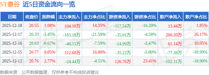 证券之星消息,截至2025年12月18日收盘,ST景谷(600265)报收于20.55元,上涨1.08%,换手率0.27%,成交量3516.0手,成交额725.47万元。