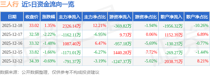 证券之星消息,截至2025年12月18日收盘,三人行(605168)报收于33.02元,上涨1.35%,换手率2.72%,成交量5.73万手,成交额1.91亿元。