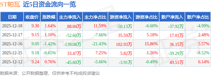证券之星消息,截至2025年12月18日收盘,ST帕瓦(688184)报收于9.3元,上涨1.64%,换手率0.81%,成交量8168.0手,成交额759.37万元。