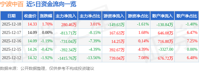 证券之星消息,截至2025年12月18日收盘,宁波中百(600857)报收于14.33元,上涨1.7%,换手率2.92%,成交量6.56万手,成交额9321.57万元。
