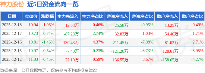 证券之星消息,截至2025年12月18日收盘,神力股份(603819)报收于10.94元,上涨1.96%,换手率1.13%,成交量2.45万手,成交额2681.66万元。
