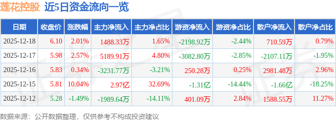 证券之星消息,截至2025年12月18日收盘,莲花控股(600186)报收于6.1元,上涨2.01%,换手率8.39%,成交量150.04万手,成交额9.03亿元。