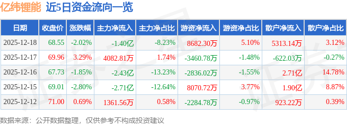 证券之星消息,截至2025年12月18日收盘,亿纬锂能(300014)报收于68.55元,下跌2.02%,换手率1.22%,成交量24.58万手,成交额17.01亿元。